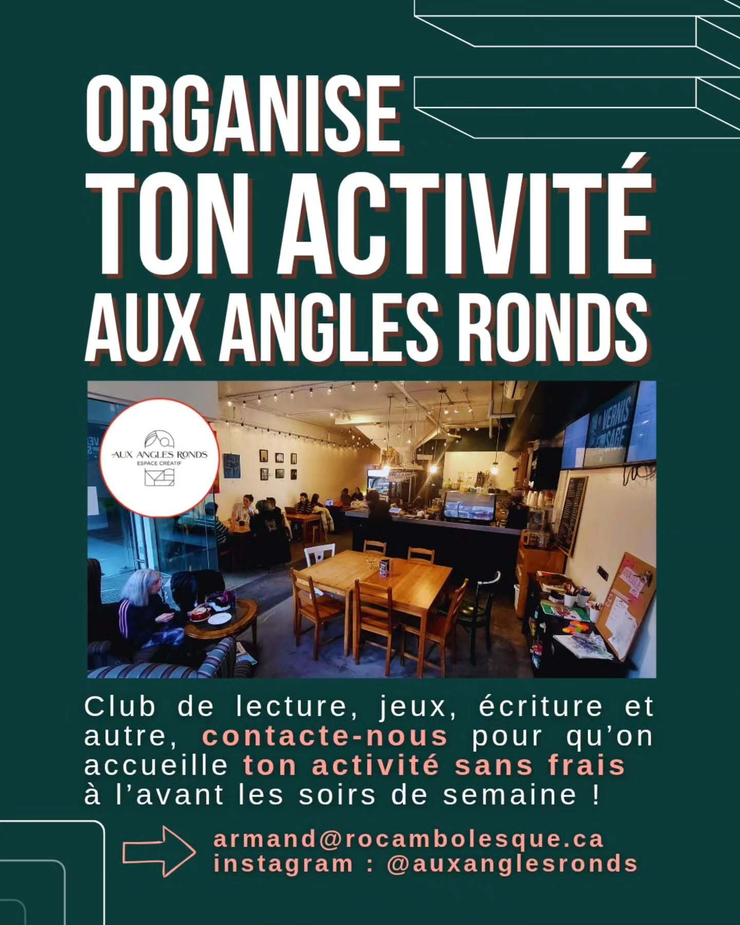 Situé sur le boulevard Saint-Laurent, au cœur du Plateau Mont-Royal à Montréal, Les Angles Ronds, propriété de La Rocambolesque, vous propose un espace chaleureux et modulable pour vos événements culturels, artistiques ou privés.