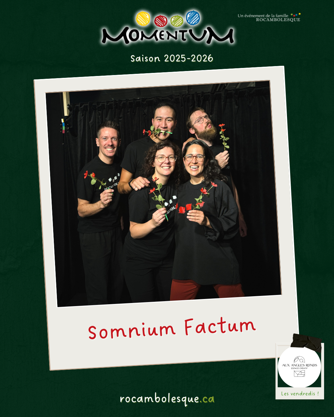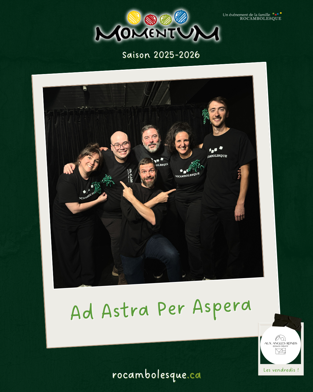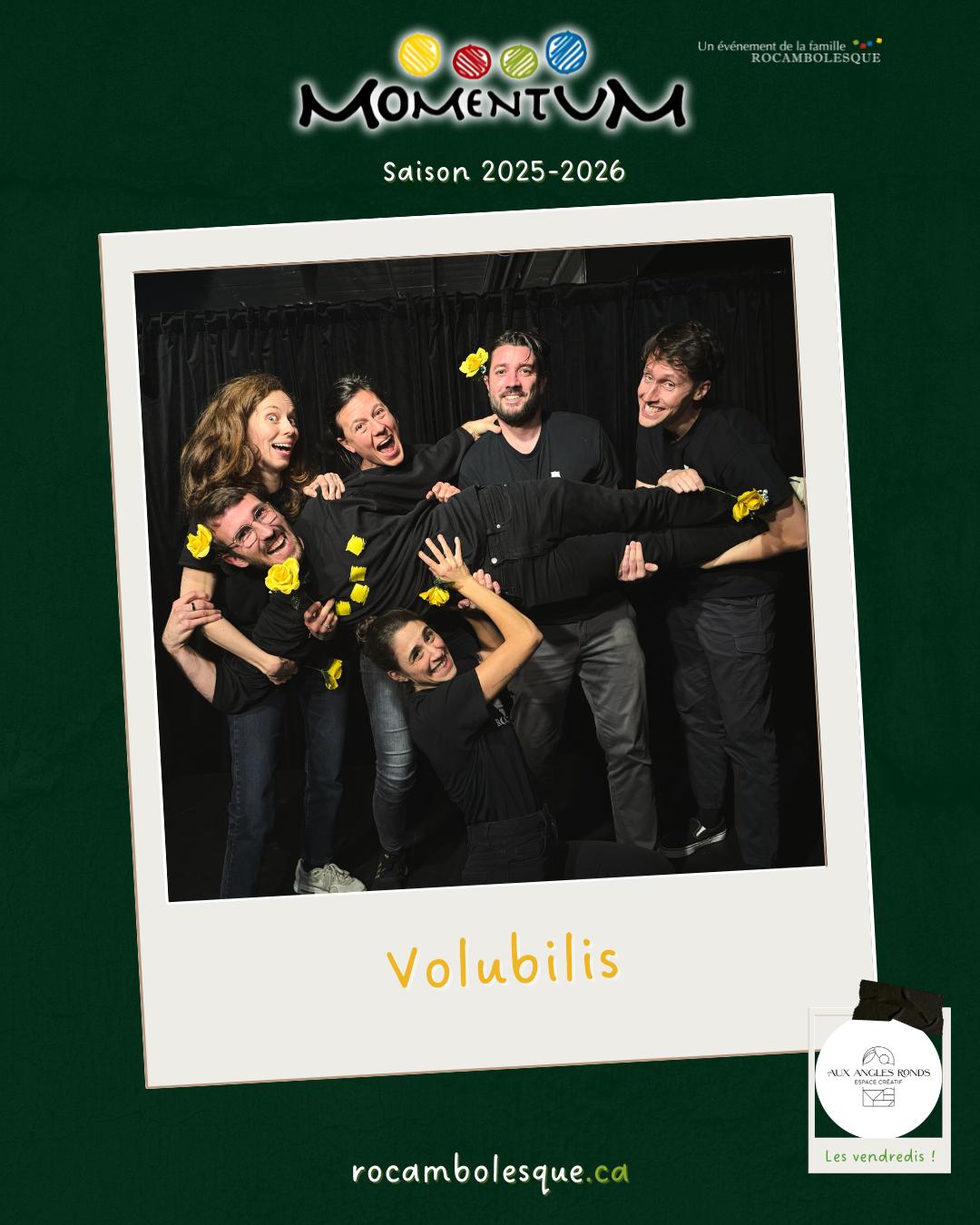 Un spectacle d’improvisation tourné vers la collaboration et dont l’impulsion est tirée d’une thématique différente chaque semaine, explorée en trois périodes par deux équipes et un maître de jeu.